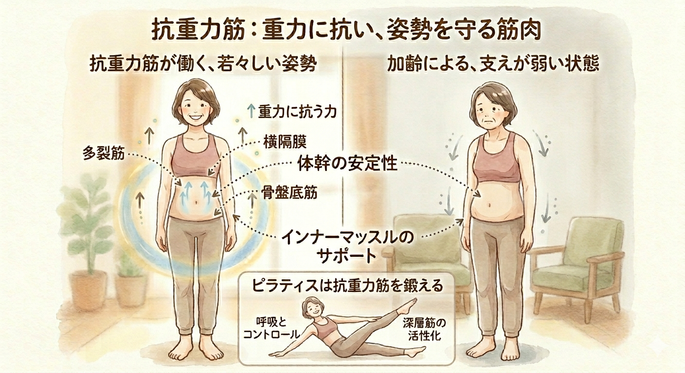 筋肉の中でも、特に衰えやすいのが下半身や体幹の「抗重力筋(こうじゅうりょくきん)」です。 文字通り、地球の重力に抗って体を真っ直ぐ保つための筋肉ですが、目に見えないこの重力がキーポイント。